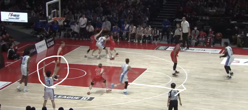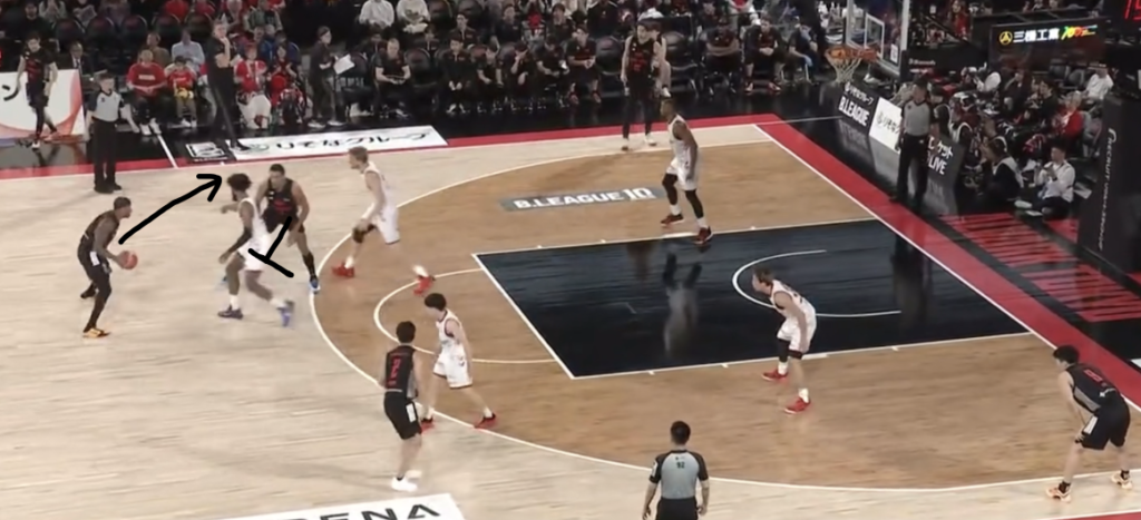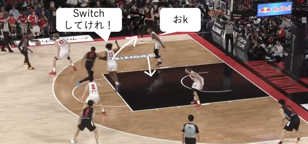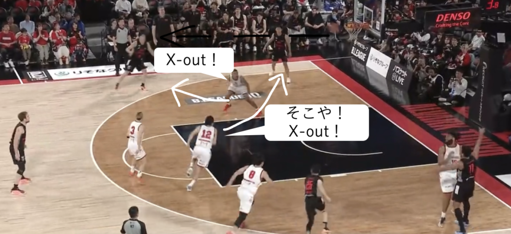 名古屋のDFで特徴的な動きとしては、まず帰化選手のオンコートを利用したスイッチDFを挙げたいです。ピック&ロールに対するスイッチはもちろん、ドライブに対してもPeelSwitchを行います。