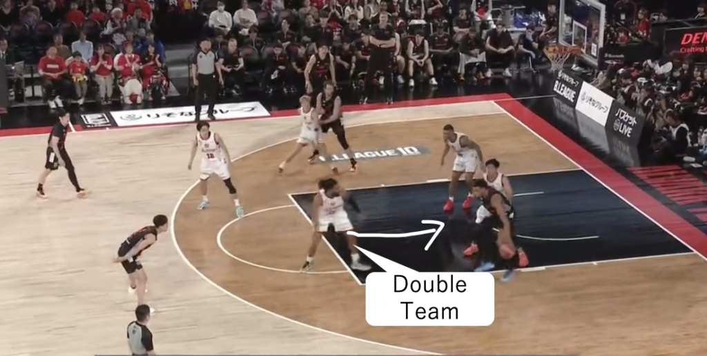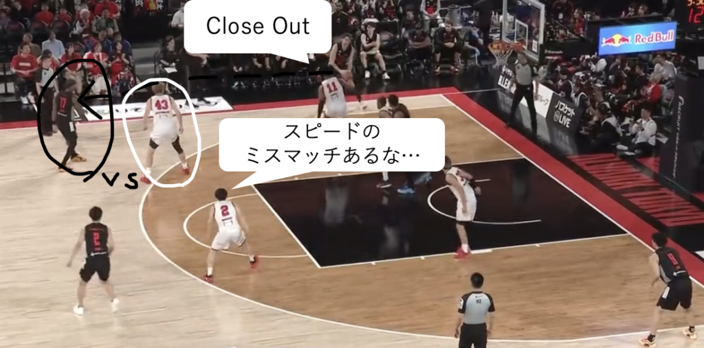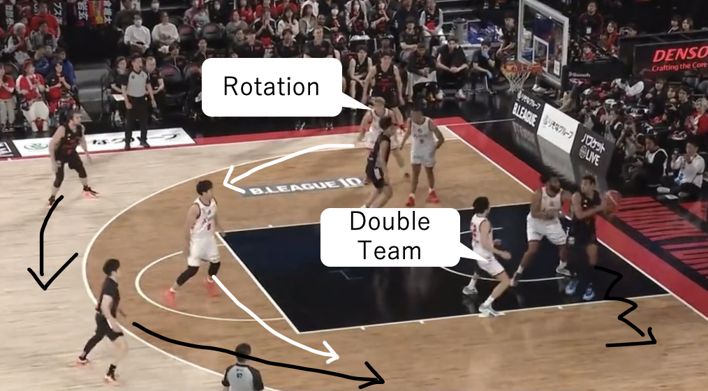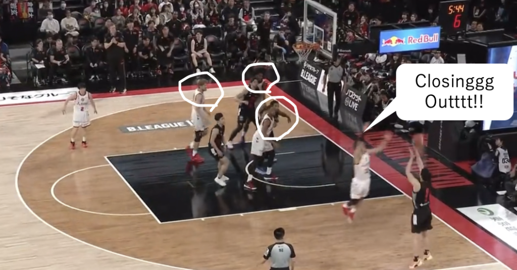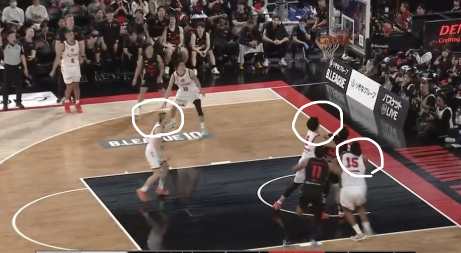このDFを遂行するには、常に味方の動きを把握し、緊急事態に反応すべきかの状況判断、そしてローテーション後に正常なマッチアップへ戻す連携が不可欠です。それを実現できる集中力・強度・身体能力を兼ね備えた選手たちと、ここまで落とし込んだコーチ陣は素晴らしいの一言でしょう。