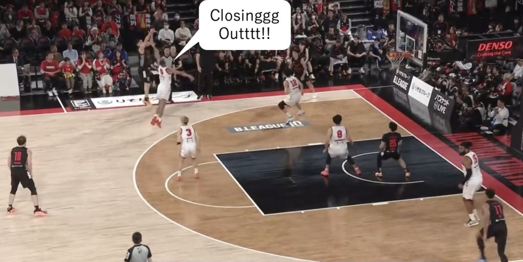 そして、ミスマッチができるや否や、躊躇なくWチームに入ります。そこからのローテーションも、一糸乱れぬ動きと速さでマークマンを受け渡していき、最後は全力クローズアウトでシャットアウトです。